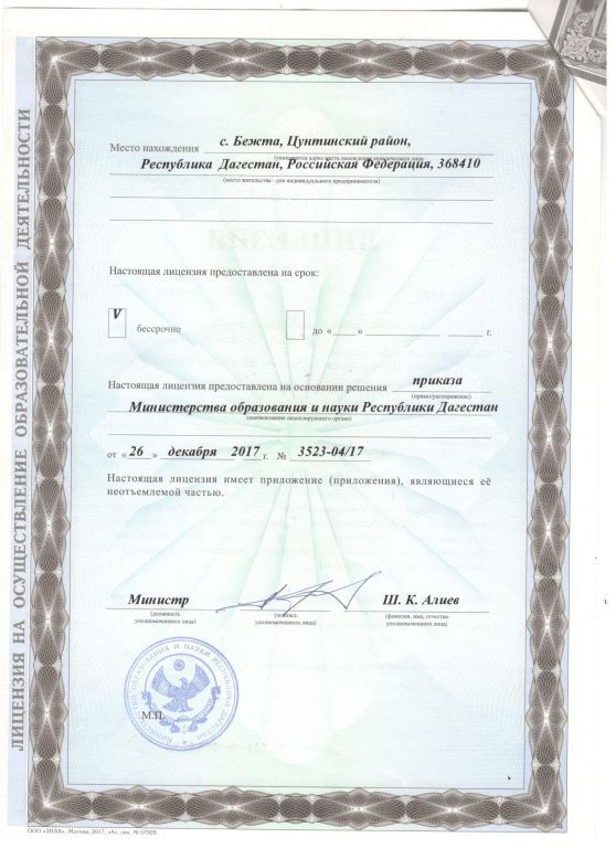 Адрес местонахождения образовательной организации* 368410, республика Дагестан, Цунтинский район, село Бежта