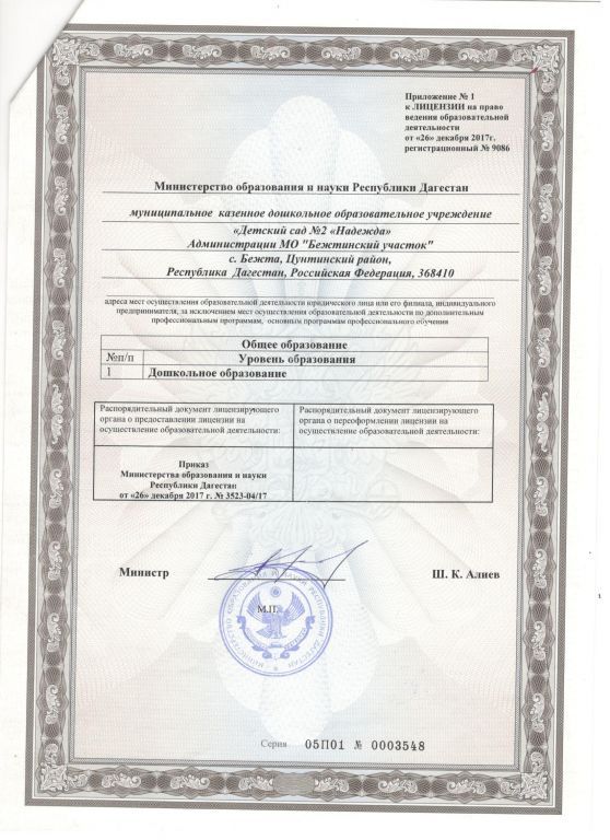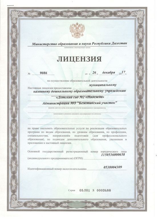 Полное наименование образовательной организации* Муниципальное казенное детское образовательное учреждение «Детский сад №2 - Надежда» Администрации МО «Бежтинский участок»